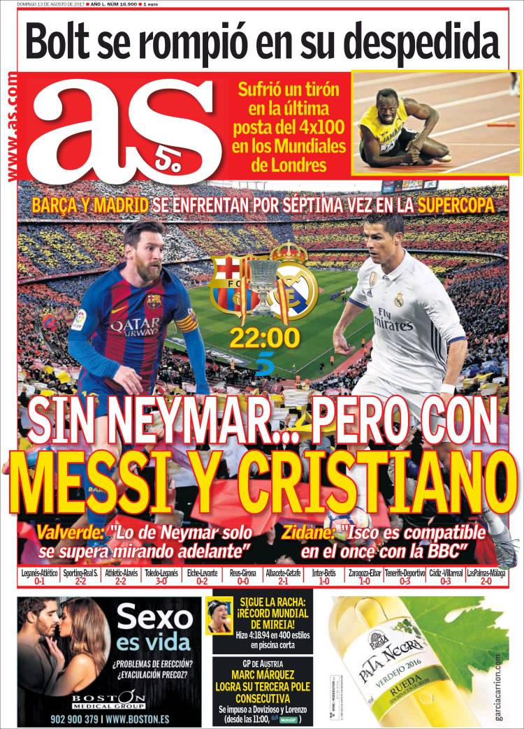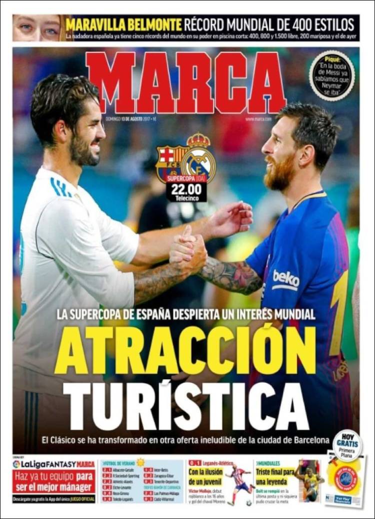 ¿No llama la atencion,la portada del Marca?¿que nos quiere decir?Por un lado,la figura y lider del Barsa y por el otro lado Isco¿nos quieren vender,que Isco es la figura y lider del R.Madrid?Yo creo que si,es y sera una de las constantes revindicaciones de esta temporada que empieza,Isco o Bale,asi un dia y otro,metiendo,de vez en cuando,a Asensio para variar.¿Se puede dejar fuera de esta portada a Cristiano Ronaldo?Por lo visto,en el Marca,SI.