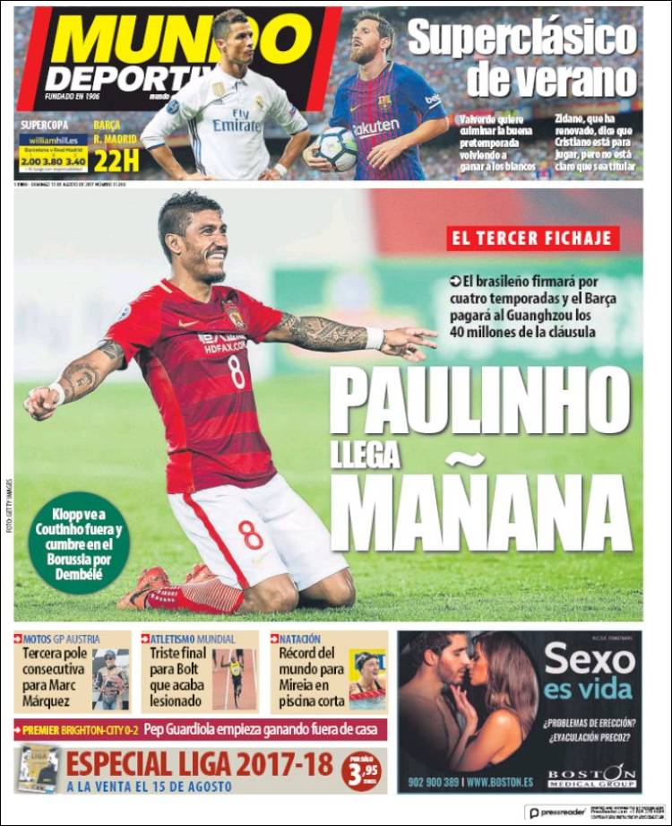 Pues eso, "superclásico de verano", "el Barça recibe en el Camp Nou al Madrid en el primer duelo oficial de la temporada", pero no, algo nos pasa cuando nos fijamos en lo que de verdad verdadera de la buena buenísima es la noticia del día y más allá. Sepan ustedes que no todos los días el Barcelona contrata a José Paulo Bezerra Maciel Júnior, elegido, sin duda por joder, peor futbolista de la historia del Tottenham por una seguramente ingrata revista. Sepan aún más, si es que aún no saben, que los 40 millones que el Barcelona es tan amable de ceder al citado Guangzhou Evergrande (grande por siempre, ¿no?) no se quedarán tan solo en China, sino que circularán nada menos que por siete clubes, según manda la FIFA por aquello de los años de formación del citado José Paulo. Así, Corinthians, Club Atlético Juventus, Bragantino, Audax, Lódzki y Vilnius se beneficiarán, en mayor o menor medida, de la generosidad culé, que no conoce fronteras y que reparte sus valors desde Brasil hasta Lituania, pasando por Polonia y llegando a China, a la Superliga china, esa que no encuentra rival posible en una mera Supercopa de España.