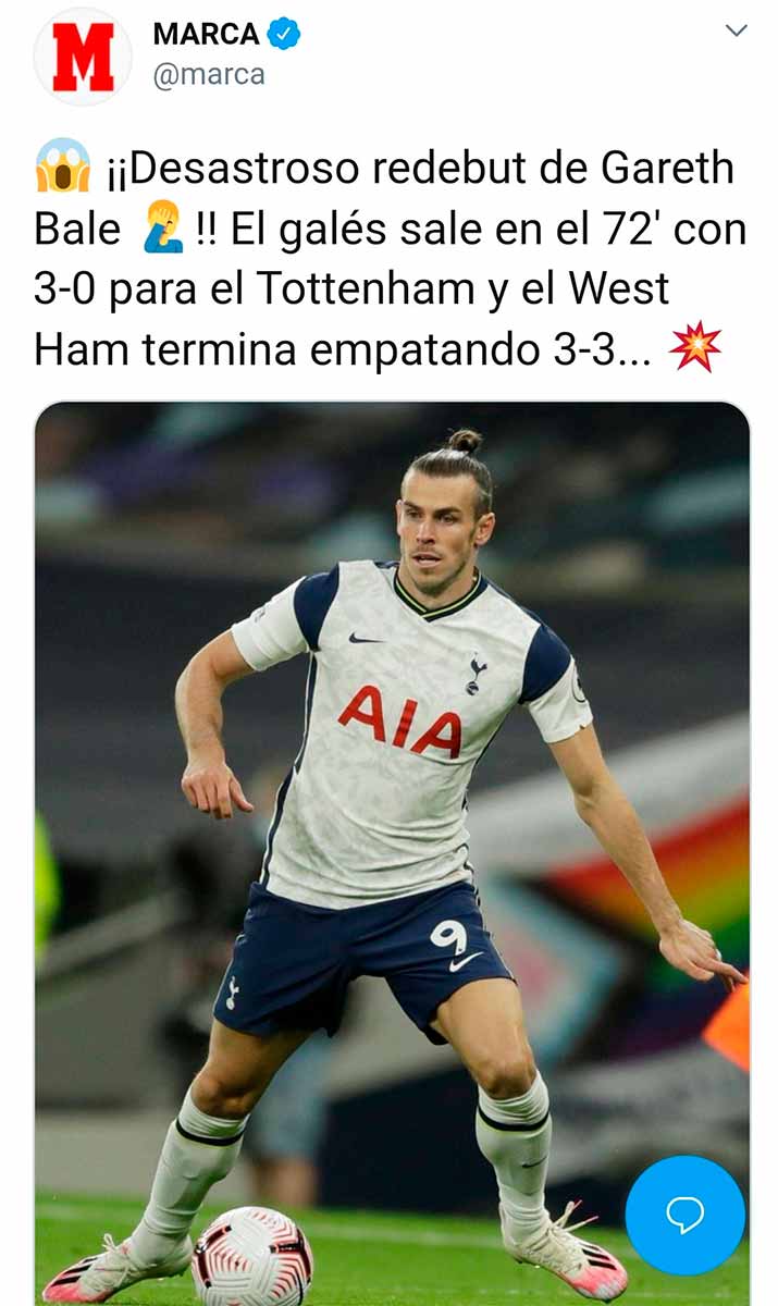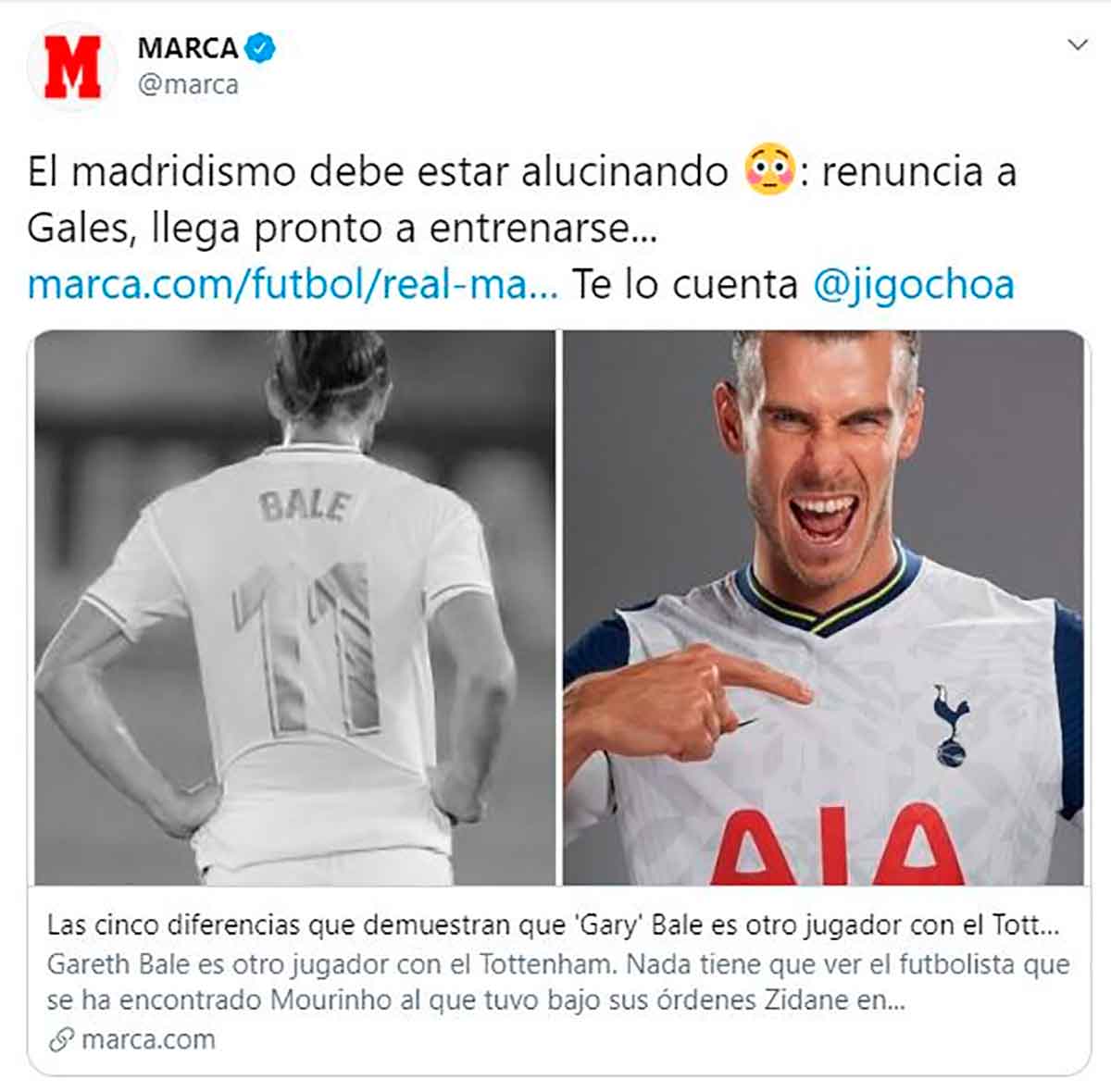 Pero tienen razón mis colegas: soy un malpensado. Siempre veo fantasmas donde no los hay y el periodismo deportivo patrio es el “más mejó” del mundo mundial. Repleto de veracidad y credibilidad. Acaba de debutar el que durante años ha sido el objetivo favorito de sus ataques: el galés Gareth Bale. Así le recibía Marca en la previa de su debut con el Tottenham: