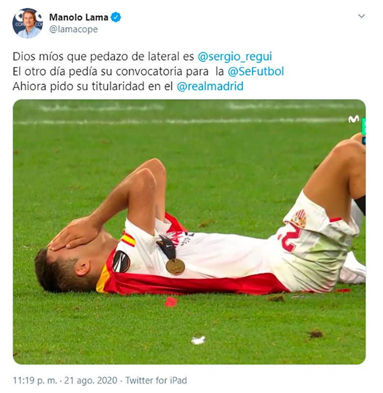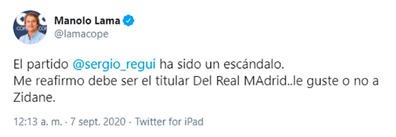 Manolo Lama PIDE la titularidad de Reguilón en el Real Madrid. ¡Manolo Lama! Y la pide “ahiora”, extraña mezcla fruto de su subconsciente, que la exigía “ahí”, en el Real Madrid, y “ahora”. Este tuit era de agosto, pero como se ve que el palito para el Madrid era suave, persistió un par de semanas después: