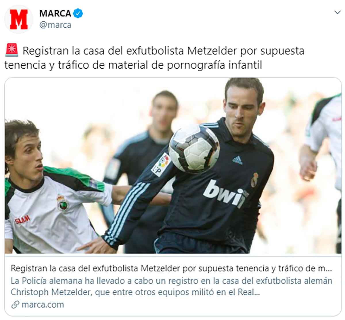 Y si no me creen, veamos qué ocurre cuando algún exfutbolista se ve implicado en algún asunto turbio. Dará igual su carrera deportiva en media docena de equipos que solo se le asociará al Real Madrid. Raúl Bravo o Borja Fernández en el caso Oikos, o Metzelder, cuyo paso por el club blanco fue testimonial: