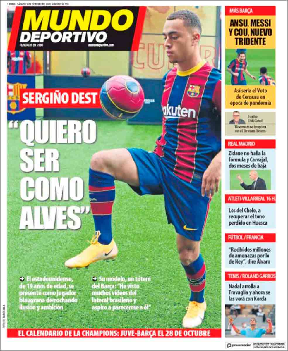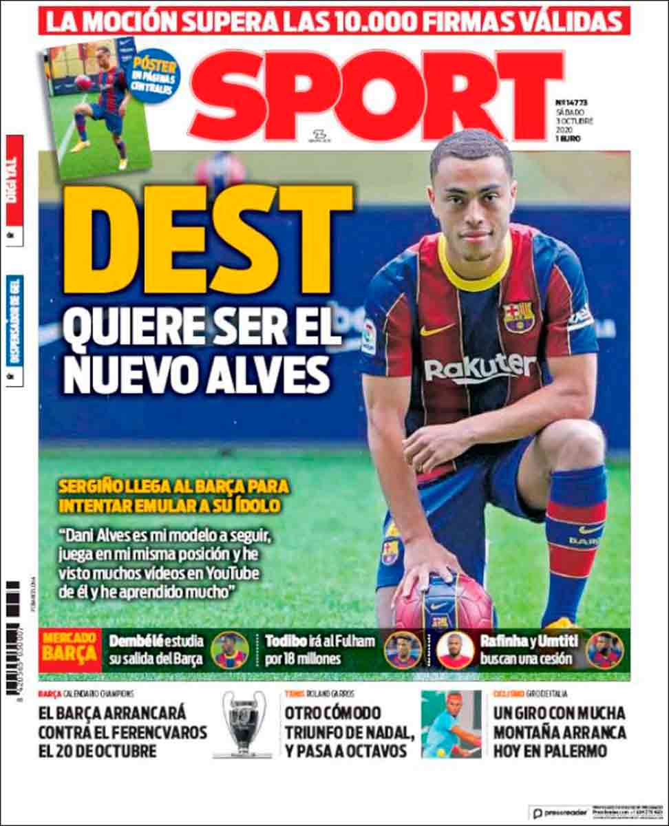 Mientras tanto, en el paraíso culé el amor sigue en el aire, como el dinero para fichar, esta vez en forma de Sergiño Dest. DEST QUIERE SER EL NUEVO ALVES. Claro, y este portanalista el nuevo Hugh Heffner, por ejemplo. Todos queremos ser el nuevo alguien sin dejar de ser nosotros mismos. ¿Todos? ¡No! Un diario poblado por irreductibles cataculés resiste, todavía y como siempre, al invasor. Ese es Sport, que toma poción mágica, como el Barsa, para ser así. La receta de la poción mágica del Barcelona es un misterio por el que a As no le parece necesario abrir un expediente, no. Se lo abre a Hazard porque se ha lesionado. Ya veis.