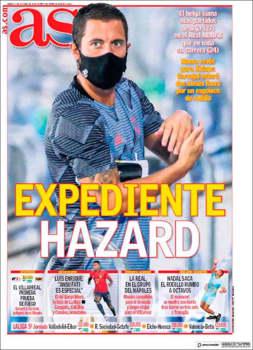 Pero para pintas tenemos, como casi siempre, a As. Emigrado Bale ahora la han tomado con Hazard, sin ningún reparo. Es gratis. ¿EXPEDIENTE HAZARD? Pero vamos a ver. ¿Qué tendrá que ver el misterio con las lesiones de un futbolista? Nosotros creemos que tanto como la elegancia con el mismo As. Un expediente sí que merece el Ouija Daily y no Hazard. ¿Cómo qué EXPEDIENTE HAZARD? ¿Hazard ha tenido la lesión más importante y delicada de toda su carrera deportiva a los veintinueve años, por la que lleva más días de baja que en todos sus años anteriores, y quieren hacer ver que eso merece un EXPEDIENTE? Y el Informe Pelícano también. Menos mal que expedientados ya están los expedientadores por buena parte de los lectores.