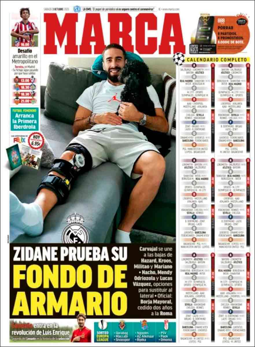 Buenos días ¿Creen ustedes que podría darse una portada de Sport, por ejemplo, en la que apareciese digamos Jordi Alba sonriendo, abrazado a un perrito y tumbado en un sofá con una aparatosa férula en su rodilla, donde se dijera: KOEMAN PRUEBA SU FONDO DE ARMARIO? Nosotros no creemos que eso pudiera suceder nunca. Es esta una portada, la de Marca, que parece recrearse en las lesiones del Real Madrid con un Carvajal cómplice. Como si fuera una fiesta. ZIDANE PRUEBA SU FONDO DE ARMARIO. Y Carvajal desternillado mientras abraza a su perrito. ¿Es un chiste? ¿Algo que ver con los armarios? Pues no lo entendemos. Si tenemos oportunidad, algún día le preguntaremos a Carvajal, a ver si él sabe algo. Por más que miramos no somos capaces de descubrir, no sólo la gracia sino el sentido.