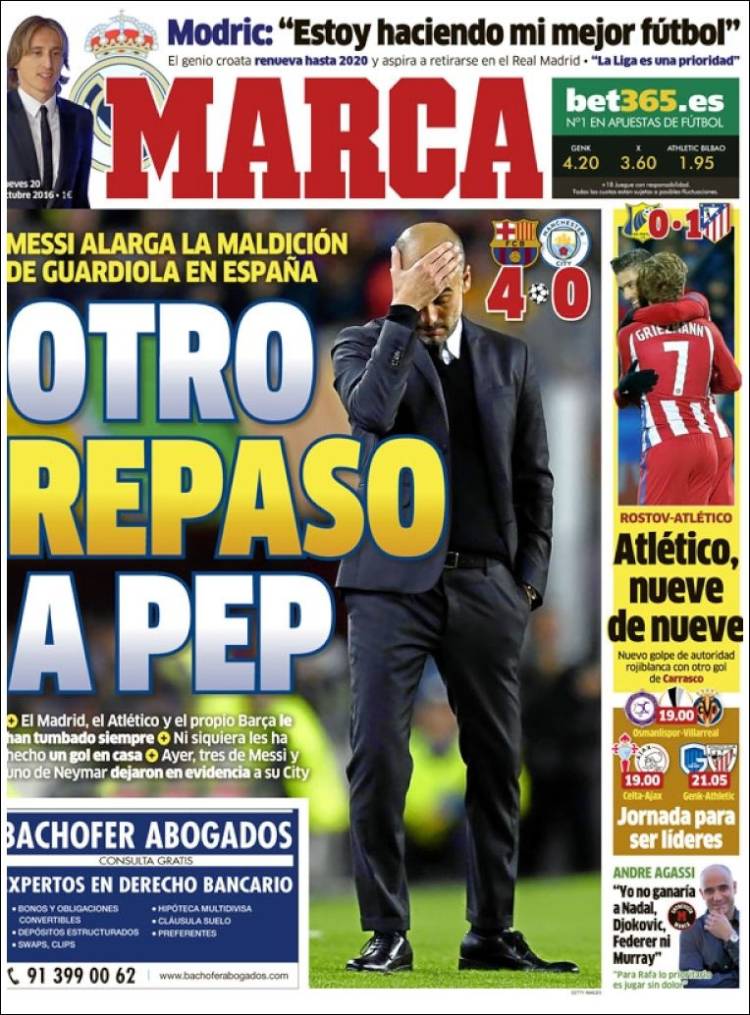 “Otro repaso a Pep”, titula Marca desde otro ángulo. Sobre Guardiola pone el foco The Hernia Chronicle y nuestro Pep se diluye ante el escrutinio cual azucarillo en un café negro cargado de Setúbal. Porque una cosa es ganar Bundesligas con el Bayern y otra ganar Champions con Mónacos y Oportos.