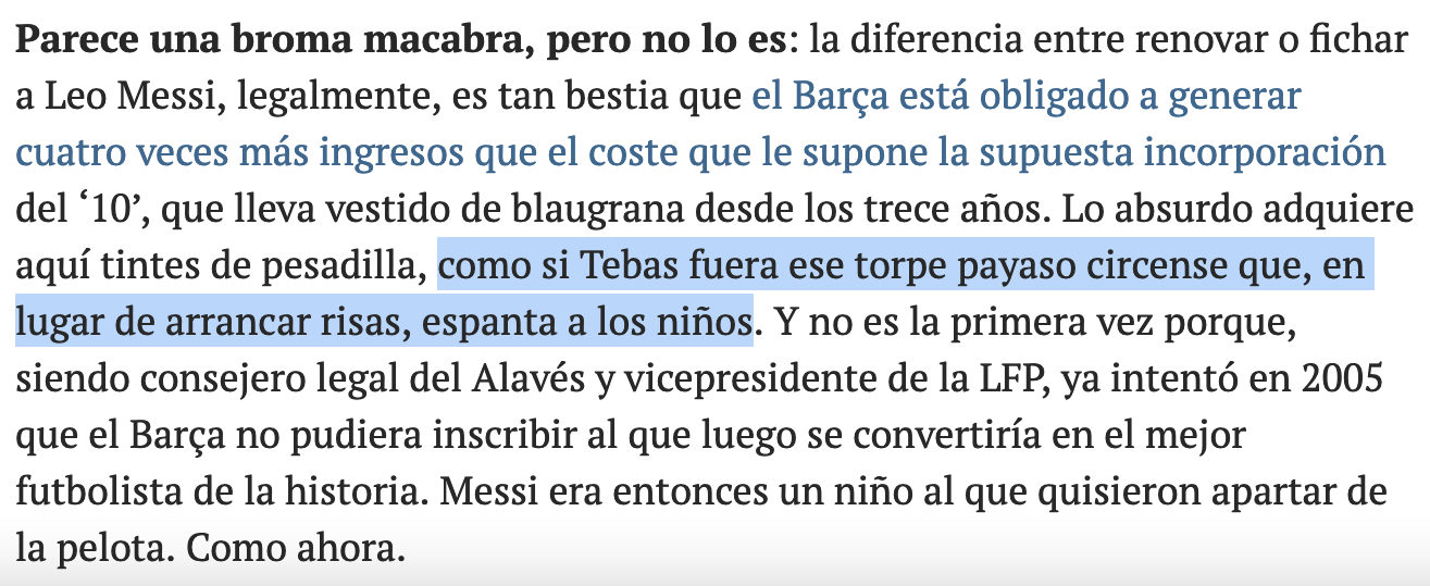 Para mí es evidente que Laporta, que no es tonto para nada, está utilizando el caso Messi para conseguir muchas cosas. Por ejemplo, tampoco tiene dinero para inscribir los fichajes que ya ha hecho. Pero, ¿Cómo se va a atrever (perdón) Tebas a no saltarse algunas reglitas aquí y allá cuando por su intransigencia centralista ha obligado al Barça a cortar esa historia de amor, etc..?