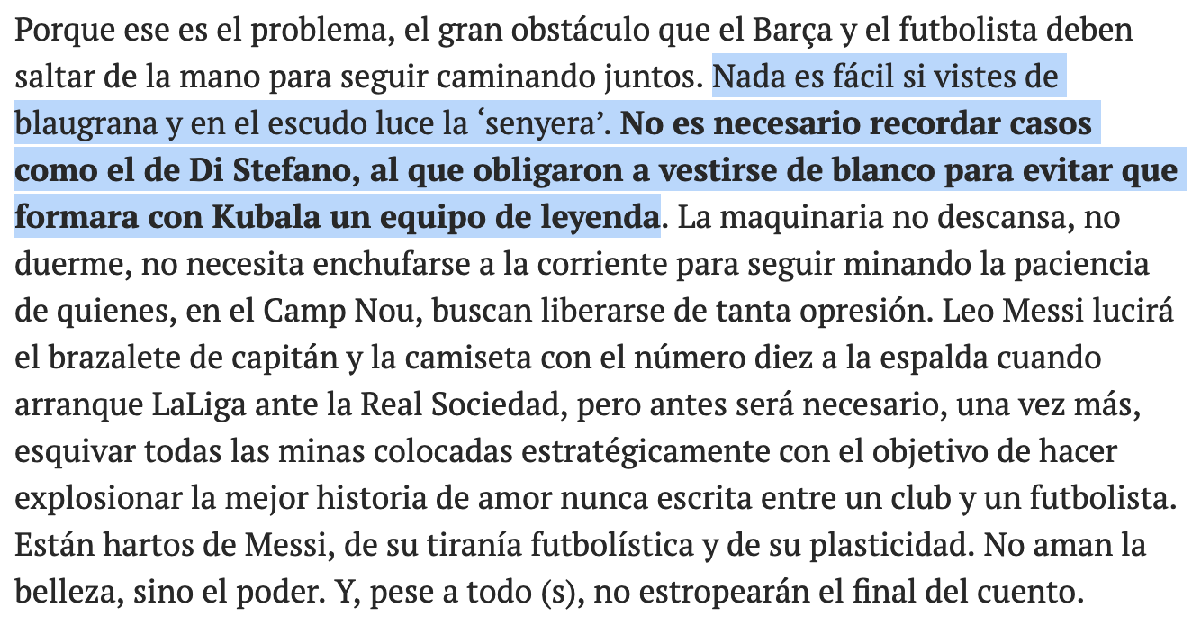 Buenos días, lamento contradecirle Astaire, pero que el barcelonismo charnegu o no, no se tragan lo de Di Stefano, no se lo cree nadie, lo tienen grabado a fuego, lo que no se creen es la intervención del entonces presidente de la Federación Española de Fútbol D. Armando Muñoz Calero en 1950 reconocido atlético, y del secretario técnico de la F.E.T. Sr. Cabot, reconocido barcelonista y curiosamente durante la guerra presidente de la Federación Española de Fútbol de la zona Republicana, a buen entendedor, en el fichaje de Kubala, al cual le trajo a España, a él y a su equipo el Hungaría Bernabeu, estos dos le dejaron bien claro que o fichaba por La ORGA o fuera de España, que aquí no jugaría profesionalmente al Fútbol, al húngaro no le quedo más remedio que tragar con tal de quedarse en la liga española, que era lo que quería, de ahí su nacionalización express, por un decreto del Consejo de Ministros franquista de la época, saltándose todos los pasos légales,( al menos varios años) , para que pudiera jugar en La Orga,