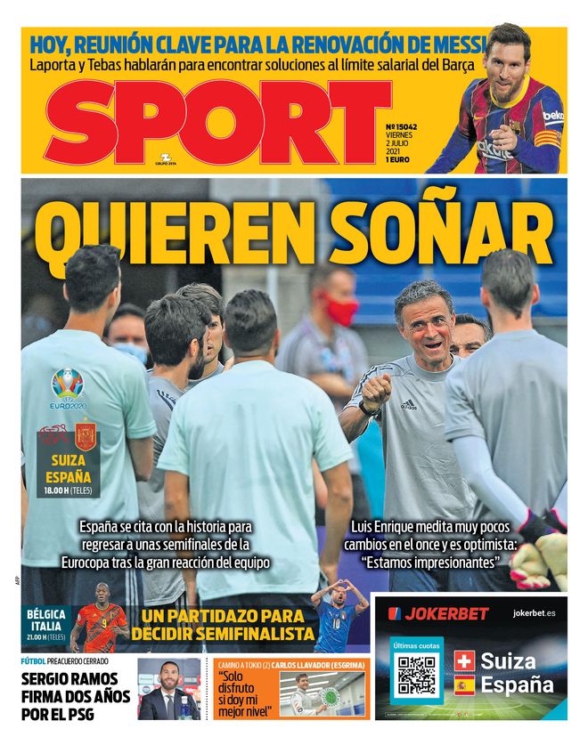 Buenos días. ¿Qué os parece, amics? ¿Cómo os quedáis? No, no nos referimos al hecho de que Sport atribuya a la selección española de fútbol la capacidad de soñar, que es lo que los seres humanos hacen al llegar a la fase REM y los equipos nacionales al llegar a la fase de Cuartos. Nos parece completamente natural que los de Luis Enrique sueñen con superar a Suiza y llegar a semifinales de la Eurocopa, y estamos seguros de que a vosotros también.