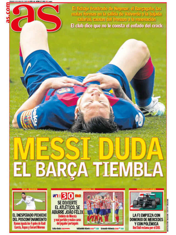 Buenos días. Creíamos que nos habíamos equivocado, pero no. Las portadas de hoy nos traen superhéroes y no son portadas de cómics de la Marvel sino, efectivamente, las portadas de hoy. Por ejemplo, en As nos presentan a Cuchitiniman, también conocido como Renovacióman o simplemente D10S, cuyo poder sobrehumano consiste en dudar y conseguir que el Barsa tiemble. Imagínense tal influjo. Messiman se pone los dedos pulgar e índice bajo la barbilla, frunce los labios y todo el Barsa, todo, se pone a temblar casi como en ¡Danzad, danzad, malditos! Es un poder neroniano, casi caligulero, Leo o Lío (Líoman, quizá) tocando la lira mientras se quema la Masía, o nombrando presidente no a Piqué sino a su caballo.
