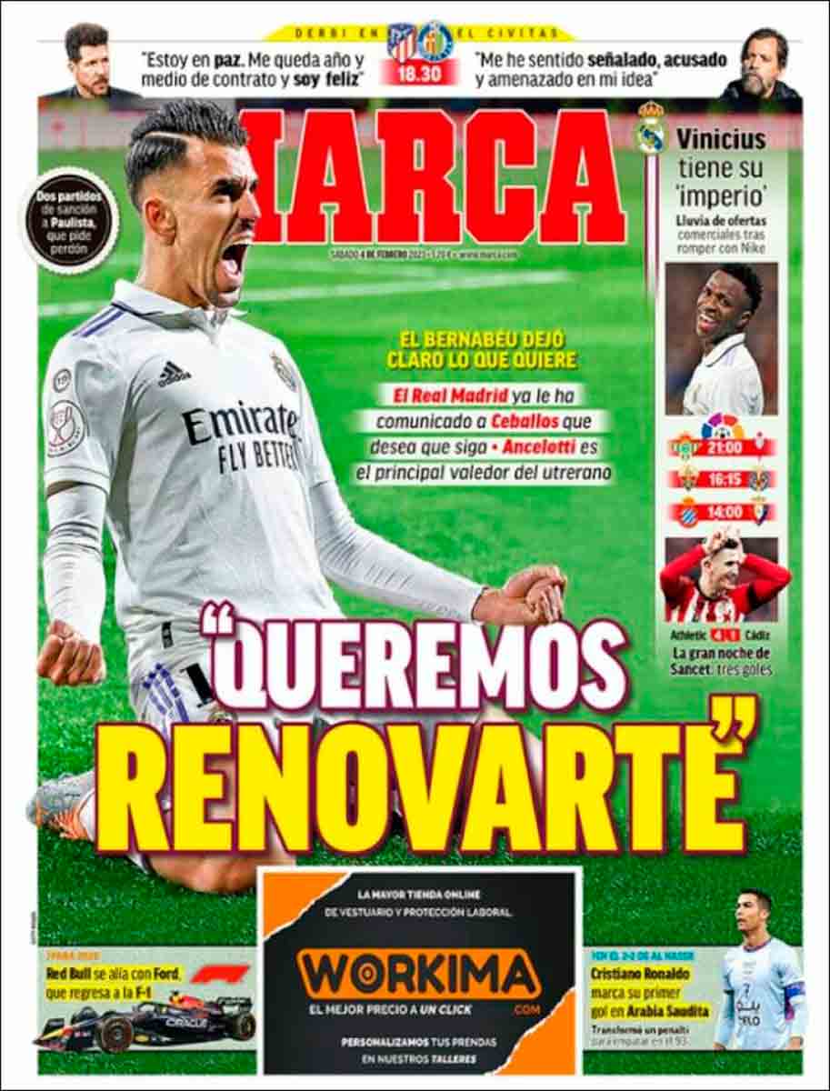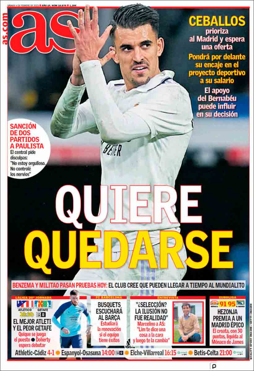 Claro, que para tener una oportunidad ante la sombra de un febrero que empina hasta el desnivel más barbárico —aún más si cabe— todas las cuestas de enero de Papás Noeles, Reyes Mágicos y Olentzeros, el lector galernauta sólo tendrá una oportunidad en la prensa deportiva de la meseta, donde nuestro protagonista es Ceballos, el utrerano de moda sobre el verde del Bernabéu y nueva musa del piperío (y del no piperío) más patrio. Dice Marca que el Real Madrid quiere quedarse con Ceballos y dice As que Ceballos quiere quedarse en el Real Madrid. Tanto monta, monta tanto, Isabel como Fernando, lo cierto es que Dani apunta a ser un rayo de sol en este lúgubre febrero que adivinaba el señor Killeen.