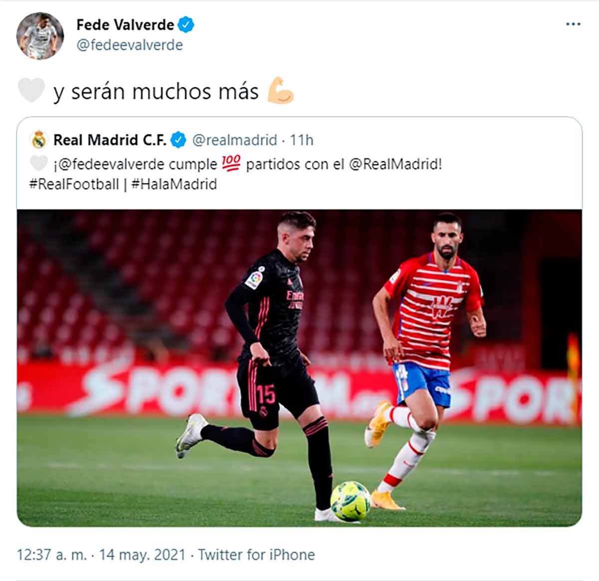 Fede Valverde ha alcanzado los 100 partidos con el Real Madrid y todos confiamos, tal y como ha publicado él mismo en Twitter, en que serán muchos más.