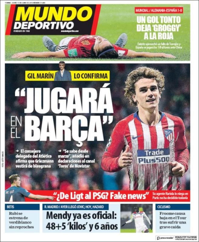 La prensa cataculé, por su parte, viene hoy con Griezmann, sobre quien Gil Marín ha revelado que el año próximo jugará en el Barcelona. Lo que no entendemos es por qué Piqué no le ha organizado al directivo rojiblanco un buen reality-show en el que ofrecer al mundo la hermosa revelación. Piqué. Griezmann. Gil Marín. Hay en la vida LOLs, amigos del alma, que son imperecederos.