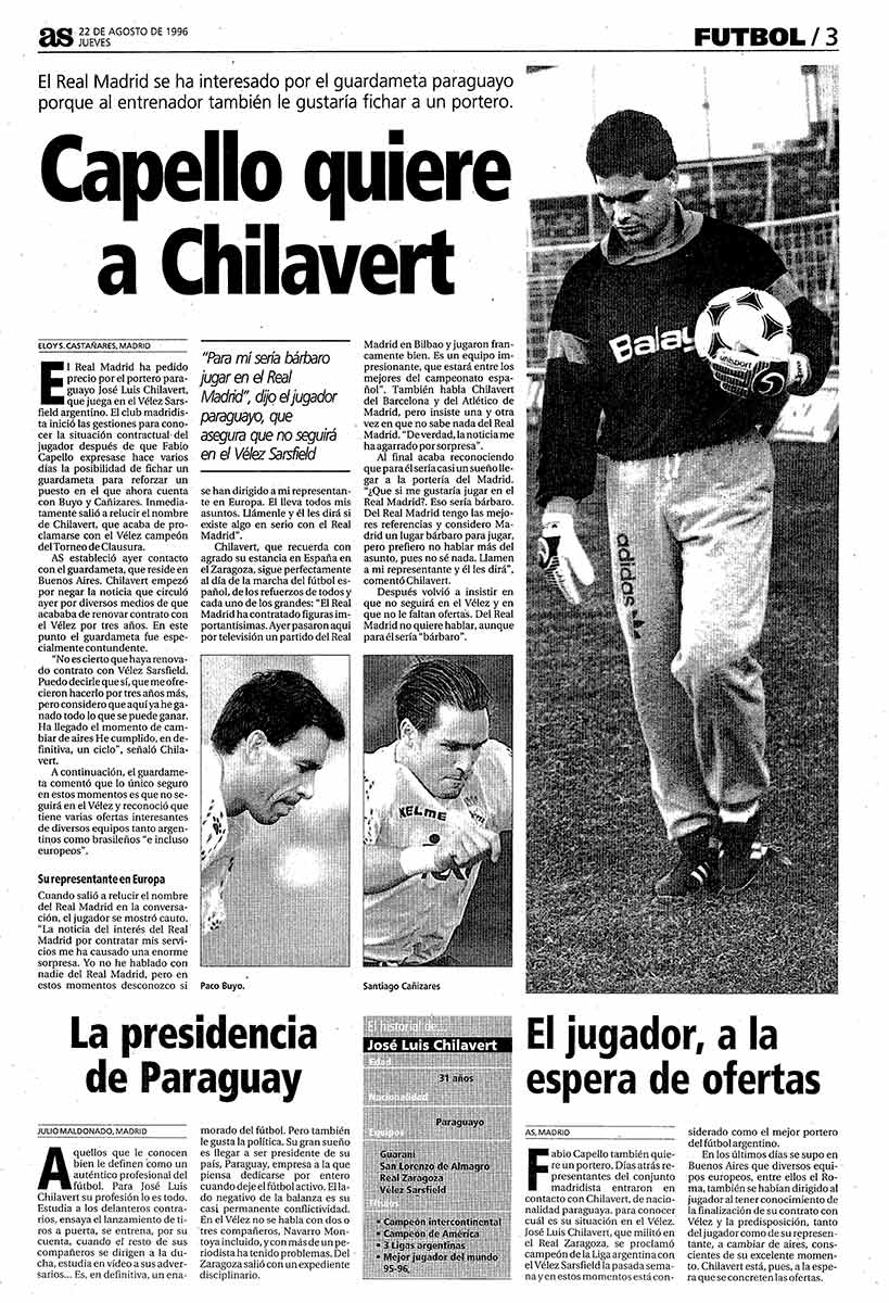 Por su parte, AS el mismo día daba un nombre mucho más impactante y conocido para los aficionados blancos. Chilavert. El Madrid había preguntado por el paraguayo a Vélez ya que Capello no se sentía seguro ni con Buyo ni con Cañizares. El arquero recogía el guante y afirmó a AS que “su ciclo en Vélez había terminado y ha llegado el momento de cambiar de aires”. Además, admitía que “para mí sería bárbaro jugar en el Real Madrid”.