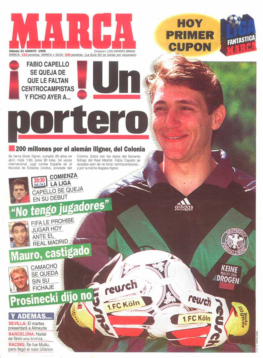 Las últimas horas antes del cierre de mercado el 30 de agosto en el entorno merengue se hablaba más de Matías Almeyda (que finalmente fue al Sevilla) y de Flavio Conceiçao. Por eso la sorpresa fue importante cuando se anunció a Bodo Illgner del Colonia. El portero alemán, campeón del mundo, contaba con 29 años, un gran bagaje en el fútbol europeo y cumplía las características requeridas por Capello al pasar del 1,90m.