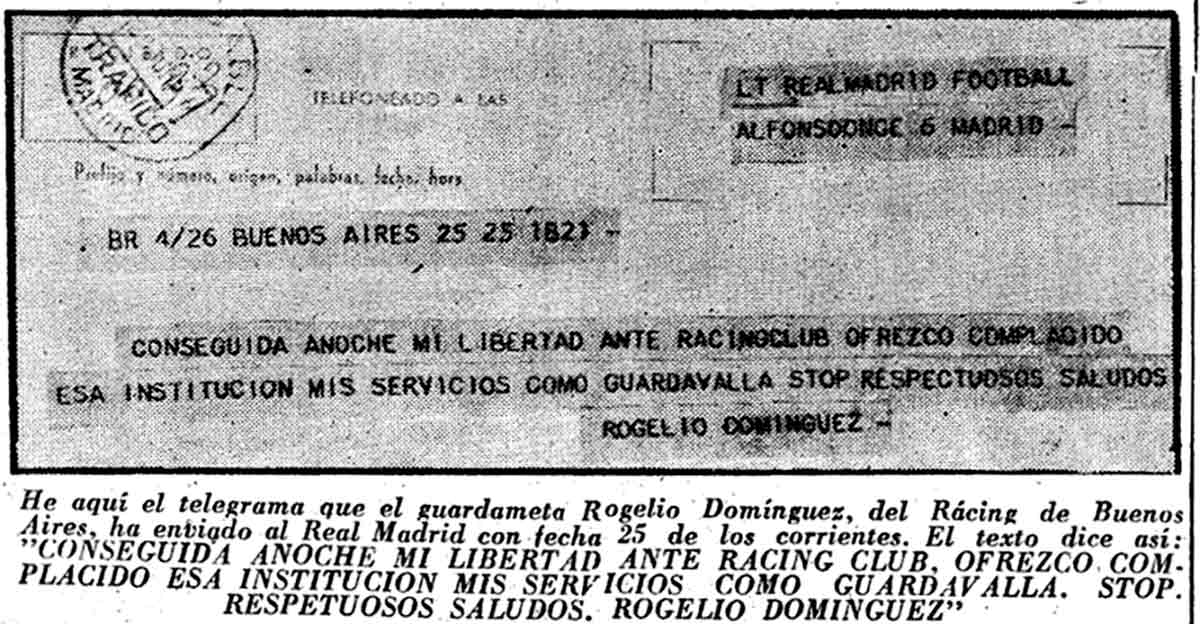 Dicho y hecho. Un día más tarde, Rogelio Domínguez informó a la institución blanca que había logrado comprar su libertad a Racing y quedaba desvinculado del equipo argentino. Envió un telegrama al Real Madrid para confirmar la operación. El conjunto blanco no quiso confirmar las cifras, como venía siendo habitual, pero sí hubo una variación respecto a las primeras informaciones y es que el contrato de Domínguez sería por cuatro temporadas y no por dos. Bernabéu, en las páginas de MARCA, se mostró contento con el fichaje, indicando que “Domínguez tiene 25 años. Y esto es lo que pretendemos: ir adquiriendo gente joven de clase para evitar que nos coja el toro. Así, junto a di Stéfano, que tiene ya 30 años, tenemos a Kopa, con 25 tan solo; al lado de Alonso, el citado Domínguez; en contraste con Lesmes, Santamaría; detrás de Muñoz, nuestro magnífico capitán, los noveles Santisteban y Ruiz, etc”.