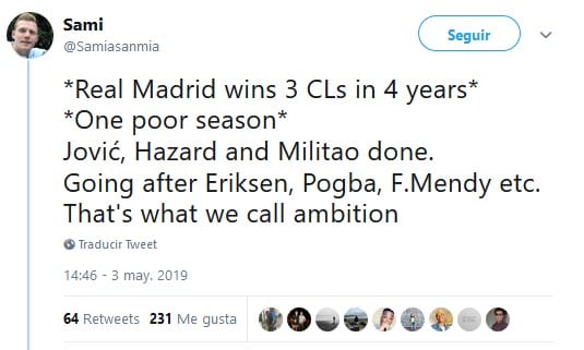 “El Real Madrid gana 3 Champions en 4 años. Una por temporada. Jovic, Hazard y Militao cerrados. Van tras Eriksen, Pogba, Mendy, etc… Esto es lo que llamamos ambición”.