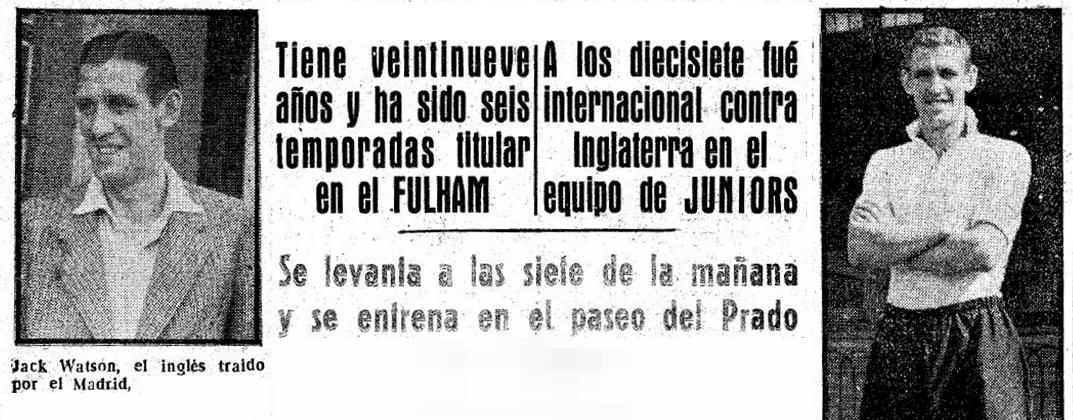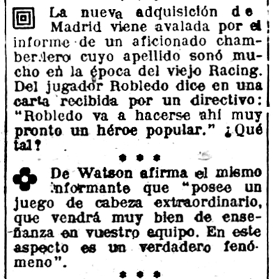 El otro fichaje es más anónimo y pertenece a otra época mucho más antigua. Se trata del escocés John Watson, que llegó a Madrid en 1948. En el diario ‘Pueblo’, el 10 de junio de aquel año, se publicó el interés del Real Madrid en Watson y George Robledo, un atacante anglochileno muy valorado en Inglaterra por su desempeño en el Barnsley y el Newcastle. Sin embargo, él no ficharía por los blancos debido a las altas pretensiones económicas de las urracas. En la nota del periódico que firmaba Josetín se informaba de que ambos jugadores venían avalados “por el informe de un aficionado chamberlero cuyo apellido sonó mucho en la época del viejo Racing madrileño”. En una carta recibida por un directivo madridista el informante indicaba que “Watson posee un juego de cabeza extraordinario, que vendrá muy bien de enseñanza en vuestro equipo. En este aspecto es un verdadero fenómeno”.