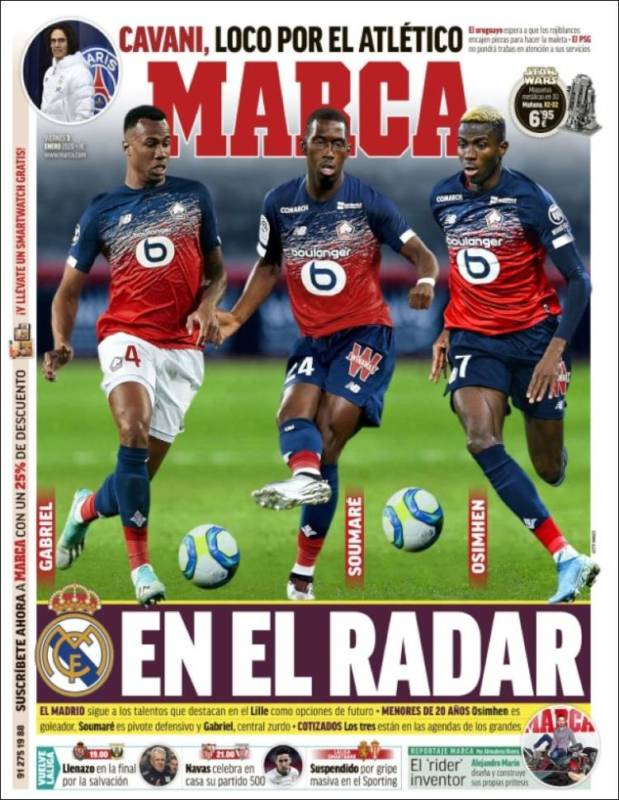 El resto de portadas del día son de una inanidad insondable. Marca viene con tres posibles incorporaciones (entendemos que en este caso para verano) a las que en el caso de Marca conviene otorgar un grado de credibilidad razonablemente alto. No hay que asumir ni mucho menos que estos fichajes llegarán, pero es posible que sea verdad que el Madrid los observa con atención. Este humilde portanalista reconoce no haber visto jugar en su vida (Hulio) a estos tres puntales del fútbol francés, pero es indudable que de cara al futuro nos vendría bien reforzar precisamente las zonas que ocupan estos futbolistas.