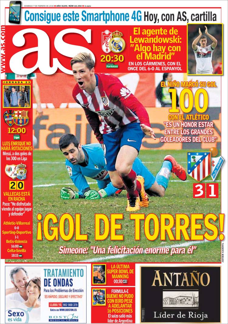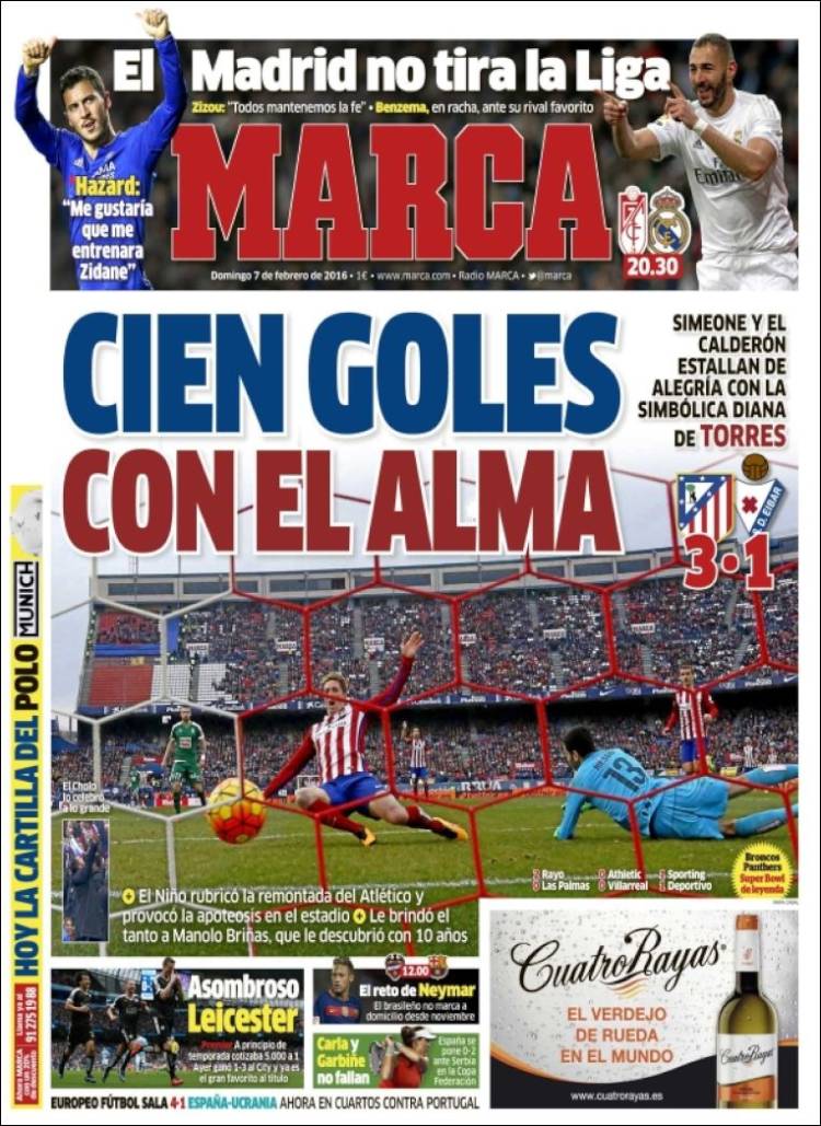 Más serias vienen las portadas madrileñas, ocupándose al detalle del partido que el Madrid juega esta tarde en Granada, pero todo lo contrario. Hemos dicho que hoy los niños eran los protagonistas, y si hay un niño oficialmente niño en nuestro fútbol ese es Fernando Torres. (Por cierto, ¿hasta cuándo será niño? ¿No es tal apodo en el fondo un lastre a medida que los años pasan? Qué cosas). Creemos que Marca y As se refieren al mismo Fernando Torres relegado a la grada del Calderón como no convocado, y también al mismo Fernando Torres a quien su entrenador -Diego Pablo "peligrosamente preparada" Simeone- le ha dicho que se busque equipo la temporada próxima, pero viendo hoy las portadas de Madrid, vamos a tener que confirmar si efectivamente se trata del mismo jugador.