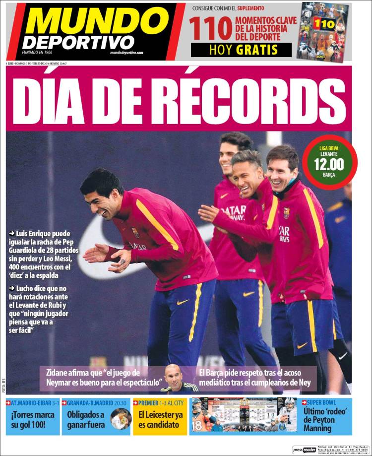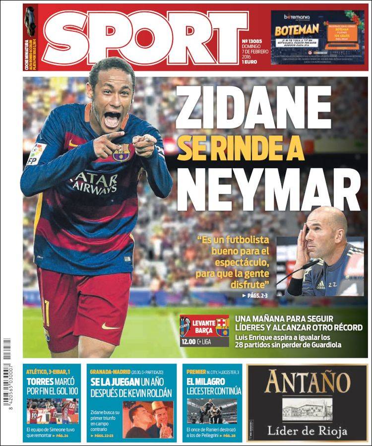 En realidad quien se burla de nosotros no es el jugador blaugrana, sino Sport, y eso ya nos extraña muchísimo (pero mucho de verdad, no saben ustedes cuánto, tal vez infinito que tiende a cero). "Zidane se rinde a Neymar". Toma ya. ¿No oyen los matasuegras y las risas enlatadas? Ya no hay duda de que ha empezado el carnaval y lo ha hecho por todo lo alto con esta portada, perfecto trasunto de una canción de murga o chirigota. Los niños tienen estas cosas. No saben medir a veces dónde está el límite de la gracia y dónde comienza aquello de tener la gracia en el culo. Qué risas en la redacción de Sport anoche con el photoshop desatado y el rigor bajo mínimos. Bah, el rigor, ¿qué será eso? Hacemos un periódico, no una investigación en células madre, así que saca el güisqui, cheli, para el personal, que vamo hasé una portada guapa ahí y tal. Neymar parece señalar a Zidane mientras se descojona. "Semos peligrosos", que decía Makinavaja. Tal vez también pelín patéticos, pero la vida es una sola.