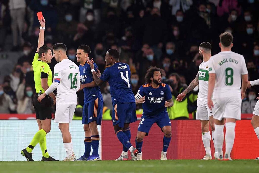 El andaluz continuó con su festival en la prórroga. En el 93' amonestó a Alaba por una entrada en la frontal a Pere Milla y en el 102' expulsó a Marcelo. La jugada era ocasión manifiesta de gol, pero en las repeticiones se observa como el brasileño toca el cuero con la puntera. Ni falta. En el VAR, de vacaciones. En la última acción del choque acertó al pitar falta previa de Verdú sobre Lucas en el gol de Fidel. Además, el central en fuera de juego obstruye la posibilidad de parada de Lunin. Pere Milla protestó esa acción y otra posterior y en el 121' se marchó a la caseta expulsado al ver la segunda amarilla.