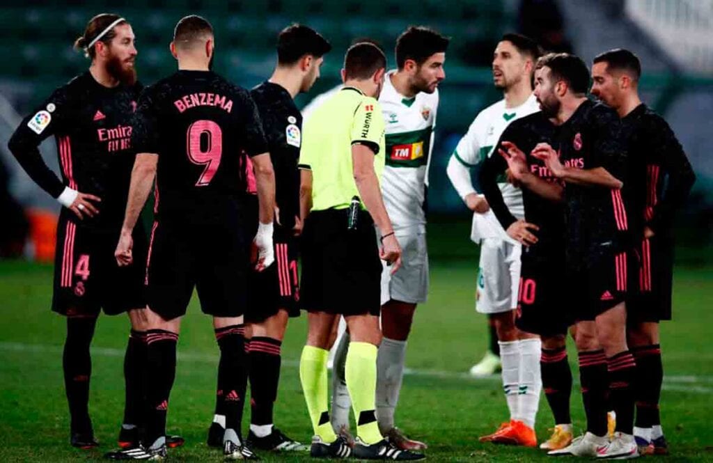 Hoy, el culerdogiado del partido, ha sido el mejor del Elche, se ha comido dos penaltys tan claros como el ha pitado a Carvajal en contra del Madrid, uno a Benzema, por agarrón tan claro y evidente k el señalado a Carvajal con 0-1 en el marcador, y otro, después del empate, por otro agarrón, tan claro y evidente como el pitado k ha supuesto el gol del empate moate, a Casemiro, el tema de las tarjetas ha sido d vergüenza ajena: el Madrid, 7 faltas y 3 tarjetas, el Elche, k es una auténtica vergüenza que haya acabado el partido con 11 jugadores, 17 faltas y una tarjeta.