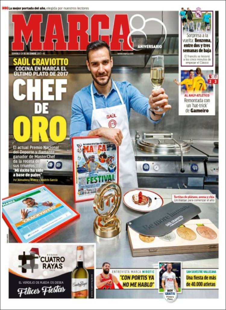 Ahora que nos hemos quedado solos, ya no habrá nadie que note la diferencia. Al menos una vez al año podemos descansar de este tormento y alejar de nosotros este caliz. Si Raphael aparece cada Nochebuena con el tamborilero, si todos los años las campanadas más sonadas son desde la Puerta del Sol, si allá que va Ramón García con su capa, si cada 1 de enero no es un día, sino aquel dolor de cabeza que es preciso pasar en el sofá hasta que llegue el día 2, este sí un día con todas las letras... Si todo esto se repite, ¿por qué no van a hacerlo las portadas dizque deportivas? Y si ellas se repiten, ¿a santo de qué vamos a estar nosotros escribiendo un portanálisis nuevo para algo que en realidad es igual a como fue hace exactamente 365 días? A santo de nada, que doce uvas son muchas uvas, tantas como Copas de Europa lleva el Madrid, y siempre hay un cuñado que corre serio peligro de atragantarse esta noche con ese número de uvas, con ese número de Copas de Europa.