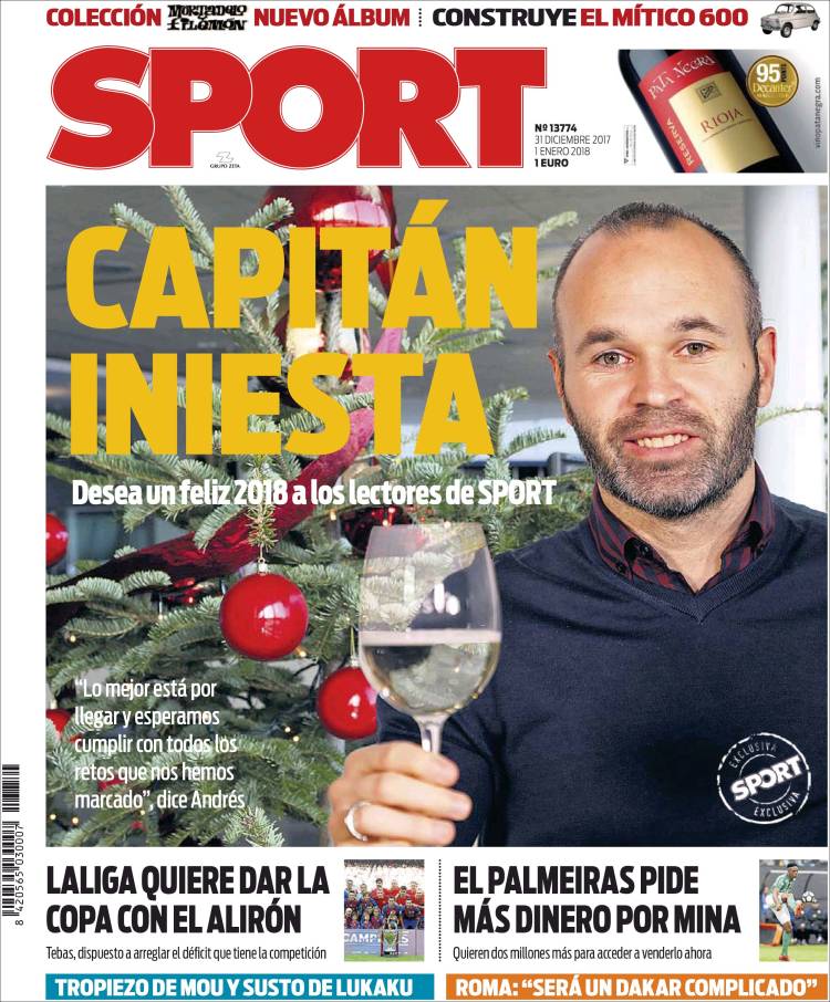 Así que pasen y vean los que aquí se hayan quedado desoyendo nuestra recomendación (y hasta nuestra súplica). Les enlazamos el portanálisis del 31 de diciembre de 2016 y Santas Pascuas o blanca Navidad o Andrés Iniesta, que tanto montan, montan tanto. Vean si no, ya que estamos, la portada que hoy nos ofrece el nunca bien ponderado diario Sport, la misma portada que nos ofreció ya no solo el último día del año pasado, sino puede que también el último día del año antepasado y el pasado del antepasado y así hasta que Iniesta (de mi vida) volviera a ser ese niño de Albacete que entró en la Masía, trasunto futbolístisco de Oz o Wonderland.