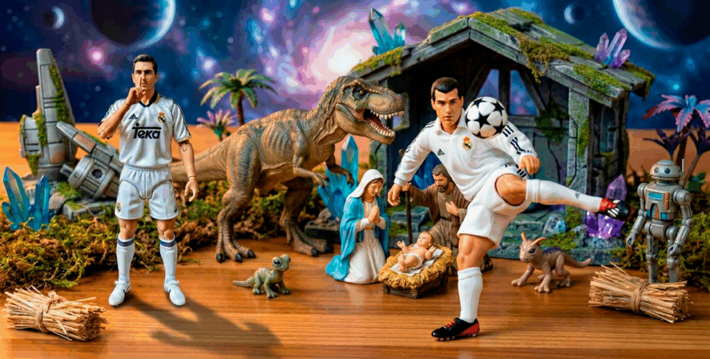 El Belén de mi casa y el madridismo de mi familia siempre han ido de la mano. Entre todas las figuras hay dos que destacan, omnipresentes, las que coronan el Portal acompañando al Arcángel Gabriel. Son Raúl y Zidane, vistiendo la camiseta blanca y haciendo, cada uno de ellos, uno de sus gestos característicos: Zidane rematando la volea de las voleas y Raúl mandando callar a un estadio. Aparecieron allí de la mano de mi hija. No negaré que yo, encaminando sus pasos hacia esta pasión tan blanca, tuve algo que ver en ello. Digamos que guie su mano para que los colocase en lo más alto, al lado de ese Arcángel que dio la buenanueva al resto. Gloria in excelsis Deo.