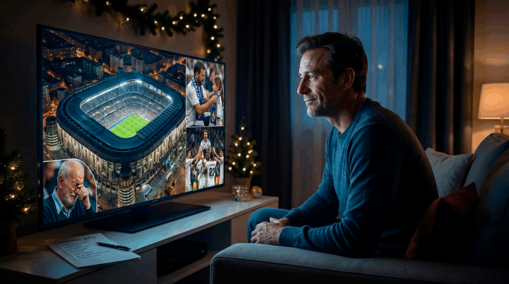 Una vista aérea del Bernabeu fue lo primero que apareció en la transmisión. Impresionante estructura llena de historia hecha e historia por hacer, iluminada de manera perfecta y dejando claro su majestuosidad al ver los diminutos asistentes deambulando por sus alrededores, ya prestos a entrar. Alfonso sonrió ligeramente al ver a los relatores afuera del estadio, recordaba dulcemente una medida tomada por el club con respecto a algunos medios de comunicación. La pantalla se iluminó con el verde impecable del césped. En ese instante, el consumismo de la tarde se disolvió. La cámara enfocó a la grada: un padre le ajustaba la bufanda a su hija pequeña, cuyos ojos reflejaban por primera vez el brillo de los focos; al otro lado, un grupo de aficionados del flanco sur ondeaban sus banderas blancas mientras cantaban sin cesar, mas allá un anciano de manos nudosas lloraba en silencio, acariciando el asiento como quien toca un altar, cumpliendo el sueño de una vida entera de radio y nostalgia, a su lado, su hijo daba muestras de infinita felicidad. Alfonso sintió un nudo en la garganta. Ahí estaba la parte humana, la cadena invisible que une a los que ya no están con los que acaban de llegar.
