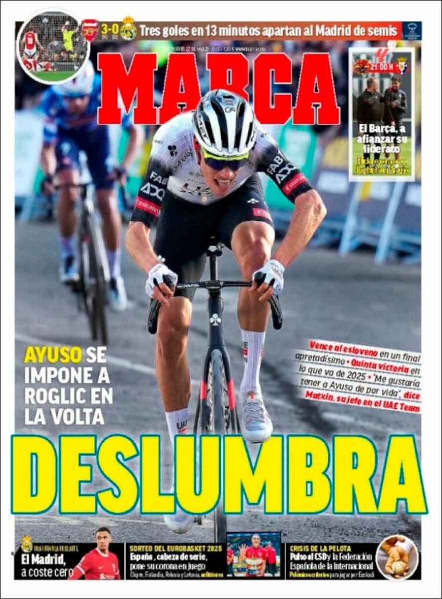 Marca se hace eco de la eliminación de este gris Madrid en la azotea de su portada, pero el protagonismo lo ceden a una irreconocible presidenta de la Comunidad de Madrid, que aparece a lomos de uno de esos vehículos que inundan nuestras aceras y pasos de peatones. «Ayuso se impone a Roglic en La Volta. Deslumbra». Desconocíamos esta faceta de la política madrileña. En nuestro descargo, confesamos que desconectamos en cierta manera del ciclismo hace unos años merced a los continuos escándalos de dopaje que adulteraron la competición. Especialmente conocido fue el caso de Lance Armstrong, adalid de las trampas en el deporte de la bicicleta.