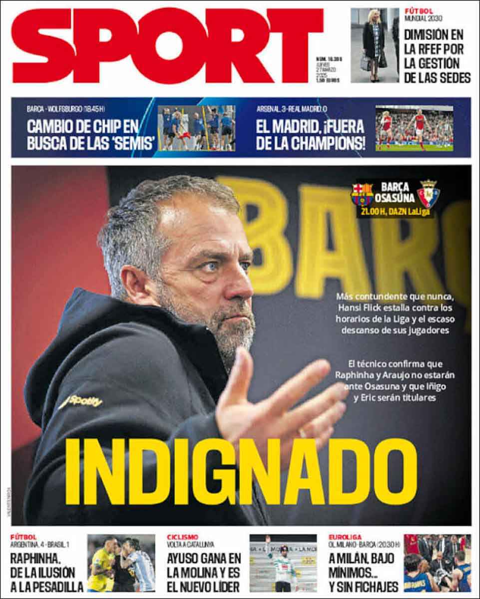 Mundo Deportivo también se hace eco de la polémica y habla de un «Flick crítico con la elección de fecha» para el encuentro que disputa hoy el Barça frente a Osasuna a las 21.