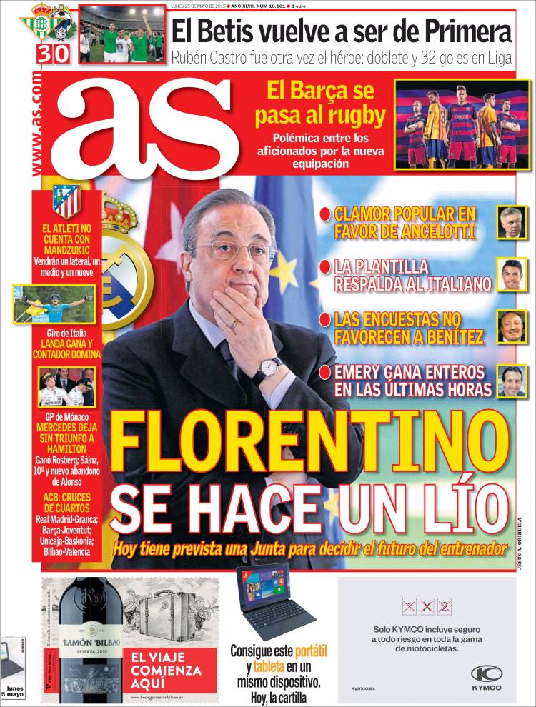 Por su parte, As participa de la polémica con un sesgo más malévolo: "Florentino se hace un lío", titula. ¿Y qué se hace, nos preguntamos afanosos, el que sacude a Ancelotti durante varios meses para luego defender su continuidad con el único objeto de atacar a quien aparentemente la cuestiona? A veces, no nos hagan mucho caso, nos da por pensar que As tiene algo contra el Presidente del Real Madrid.