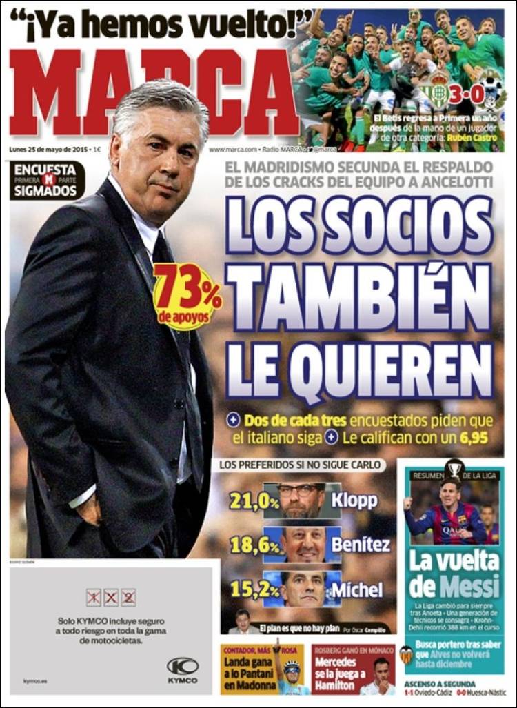 La patata caliente del probable cese de Ancelotti centra la atención de los medios. Tanto As como Marca insisten en la falta de apoyo que esa eventual decisión concita entre los aficionados, así como en el seno de la plantilla. Y se felicitan por el ascenso del Betis, club que (salvo error u omisión, y podríamos abrir un debate) consideramos amigo, y ya no quedan muchos de esos. Una cosa que alegra a Rafael Gordillo tiene que alegrar el corazón del madridismo. Extendernos más en ello comienza a avergonzarnos.