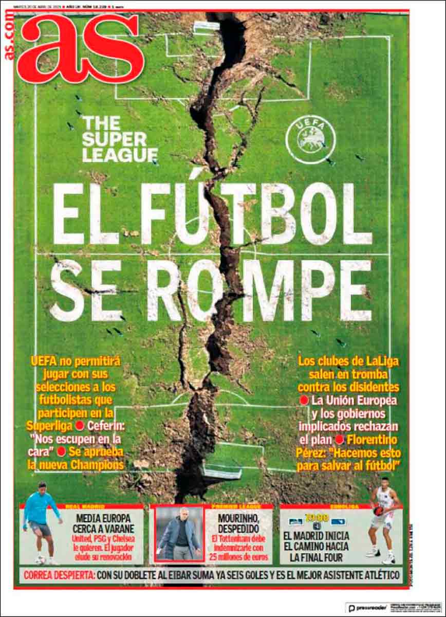 Ante la portada de As, Florentino exhaló un simple suspiro de agotamiento (era muy tarde) y ensayó un mohín de ligerísimo disgusto. Insistió en las ideas que ya había subrayado largo y tendido en el programa, y que básicamente se resumen en que la Superliga no rompe nada, que todo venía roto ya de casa y que se trata precisamente de recomponer las piezas con arreglo a un nuevo formato capaz de generar aquello de lo que aquí hablamos y que mueve a rasgarse las vestiduras a los biempensantes sepulcros blanqueados que nos rodean: dinero.