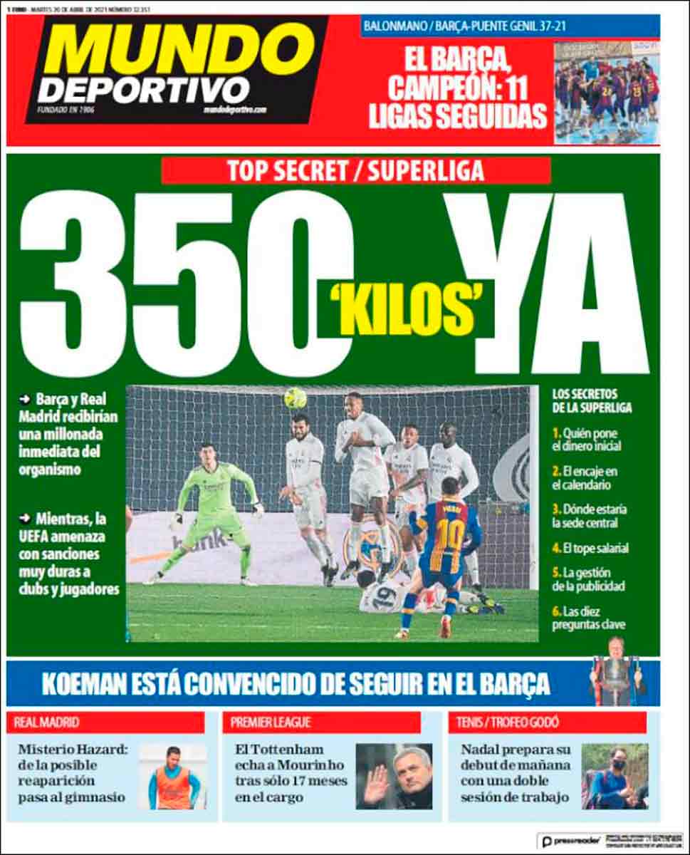 La portada de Mundo Deportivo es para descojonarse. No, no, eso no lo dijo Florentino. Perdón por el equívoco. Lo decimos nosotros. “350 kilos ya”. Florentino confirmó, enfrentado a esta portada, que en efecto esa cantidad sería puesta a disposición de los firmantes cuando eche a rodar el proyecto, pero lo gracioso es el sujeto omitido con que Mundo Deportivo engalana su titular. 350 kilos ¿qué os llegan gracias a quién, caro diario? ¿Laporta, Torra, Soros, o un señor con gafas y traje que anoche ejerció de portanalista? 350 kilos ¿¿llovidos del cielo?? No precisamente, amics, sino propiciados por el enemigo de nombre impronunciable. Aceptadlo con humildat, queridos: os está salvando el culo el tan odiado adversario, el hombre que desayuna niños crudos y compra jueces con croquetas de palco, la gran amenaza para la paz mundial. El villano innombrable os ha lanzado un flotador cuando ya os hundíais con el agua al cuello. No, no son 350 millones caídos del Cielo. Queremos oíroslo decir: gracias, Florentino. Gracias, Real Madrid, que con amabilidad, casi con displicencia, nos salvas el pellejo para que podamos seguir haciendo como que os pinchamos con nuestra arma roma de espadachín arruinado. Decidlo: gracias por tu magnanimidad, Real Madrid, tú que nos rescatas el bullate sin inmutarte. Ah, sí, esos. Hacedles hueco en los botes, pobres.