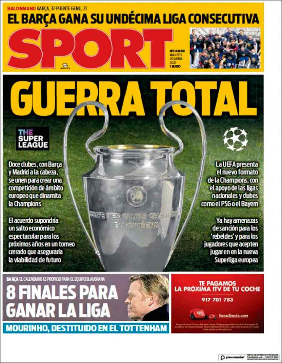 Yo creo q esto no va a cuajar. No ahora. Es sencillamente un órdago a la Uefa para sacar más parte del pastel, algo que firmarán a no mucho tardar. Cuestión aparte es que el huevo siga cociéndose en el cazo como permanente advertencia, porque los que tienen la sartén por el mango son los clubes que se han declarado en rebeldía, por así decirlo. Por lo que nos han contado de esta nueva competición hay muy poco avanzado como para arrancar en agosto. No hay tiempo, es imposible. Yo lo que me temo es que esta aventura a medio hacer nos cueste la antipatía de gente que nos puede hacer mucho daño: arbitrajes más sibilinos, sanciones desorbitadas, etc. En tiempos de amenazas mutuas, la antipatía de cierta gente puede convertirse en odio sarraceno. A falta de Superliga hecha y derecha estamos a la intemperie, al albur de lo que digan los que cortan el bacalao, es decir, los de siempre.