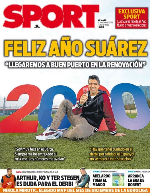 En el resto de portadas, poco que contar. 'La Ouija' mira a la selección, que es el único equipo que realmente les importa. También les importa el Real Madrid, pero sólo cuando pierde. En Barcelona, mientras tanto, 'Sport' y 'Mundo Deportivo' lucen a Messi y Luis Suárez... y por fin hablan un poco de baloncesto. Celebramos que se hayan tomado la victoria del otro día como si hubieran ganado una Euroliga de esas que habitualmente conquista el Real Madrid. Hasta Mirotic merecía una alegría en 2019. Veremos si en 2020 siguen acordándose del balón naranja en la prensa cataculé.