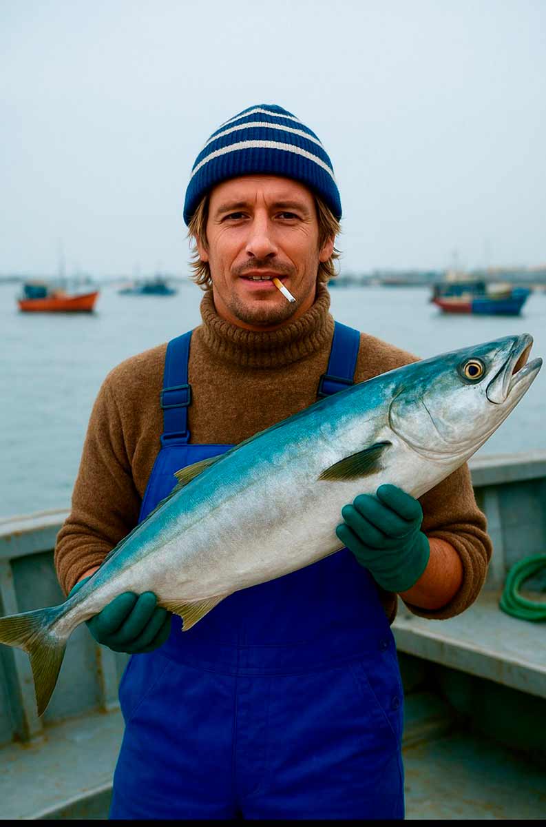 Cuando abrí la puerta de la biblioteca me lo encontré ojeando Moby Dick. Me miró y sonrió. Iba vestido con un jersey de lana gruesa, un pantalón de goma —tipo peto, con tirantes—, unas botas katiuskas y un sombrero impermeable de ala ancha, alargado por detrás. En su boca colgaba un pitillo con la ceniza consumida.