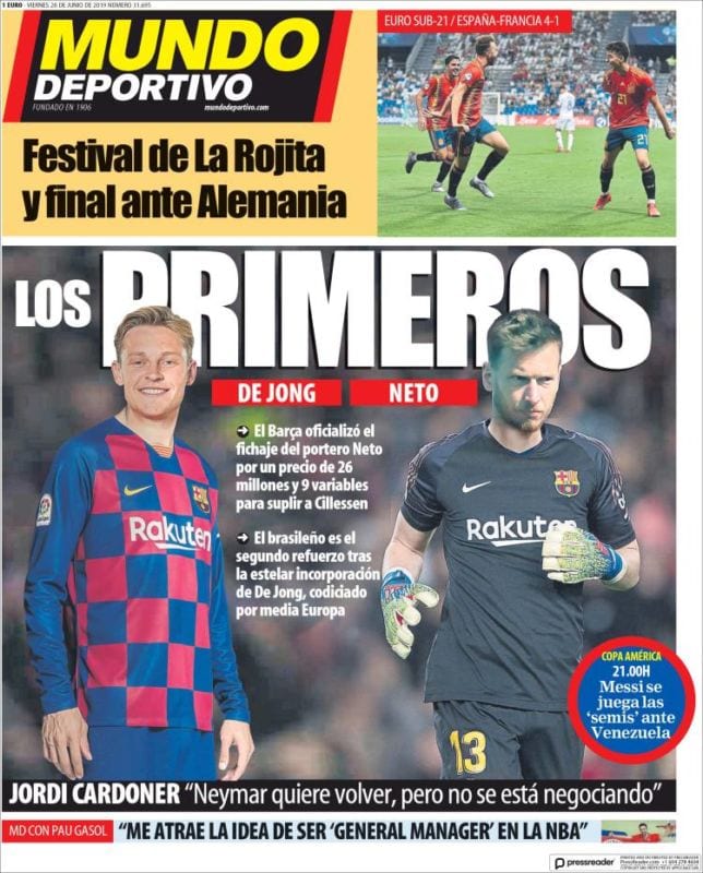 Mundo Deportivo, por su parte, tiene la gracia y el salero de traer en portada el fichaje de Neto como si fuera un logro deportivo en lugar de un simple chanchullo financiero, bastante bochornoso por cierto. Os lo cuenta Ramón Álvarez de Mon.