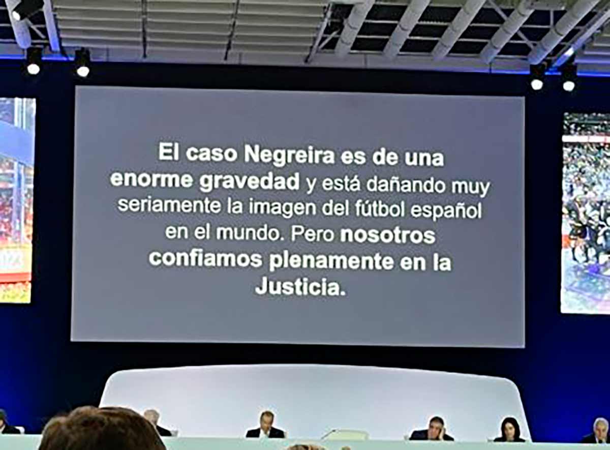Instó al Gobierno (¡al Gobierno!) a tomar medias para depurar el CTA (mucho instar nos parece eso, no habiendo nadie del CTA besado públicamente a nadie) y se refirió al asunto Negreira, de forma sucinta “pues está en manos de la Justicia”. En este punto sacó a pasear su mejor sorna castiza. Voy a parafrasearle de manera laxa pero confío en que escrupulosa: “Coincidiréis conmigo en que pagar 8 millones de euros al número dos de las árbitros durante dos décadas es una cosa que no está bien, y que reaccionar a las acusaciones que penden sobre ti imprecando al club que es el principal perjudicado de tus manejos está peor todavía”. Defendió como necesaria la personación del club en la causa judicial (me atrevo a decir que no hay un solo madridista que no la aplauda) y resaltó la extrema gravedad del affair.