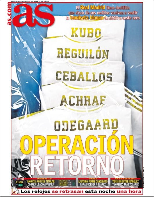 Decíamos que 'La Ouija Today', 'Sport' y 'Mundo Deportivo' abren el mercadillo y empiezan a mirar a 2020 como si estuviéramos acaban la temporada y no empezándola. Los Ex-Relañitos nos cuentan que el Real Madrid tiene pensado repescar a Kubo, Reguilón, Ceballos, Achraf y Odegaard. Todos ellos tendrían sitio en el equipo blanco la próxima campaña. Y, como broche de oro, Mbappé, que lleva viniendo tres años. Tanto va el cántaro a la fuente que ojalá se rompa.