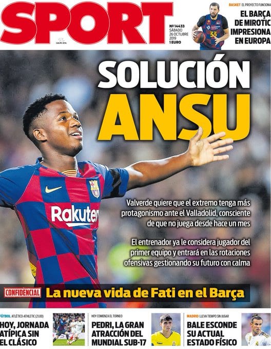 Por último, 'Sport' recurre a Ansu Fati, esa estrella emergente de la que tiran cuando no hay nada más, como Ernesto Valverde, vaya, que ha dejado de contar con él en cuanto han vuelto las vacas sagradas. Menos mal que ahora vienen partidos entre semana y en nada irrumpe la Copa del Rey para que el chaval vuelva a tener protagonismo. Pasen ustedes un sábado estupendo.