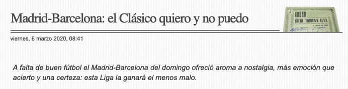 Esta es la entrada del artículo escrito por Carlos Carpio para la contraportada de Marca de este viernes. Dice que faltó buen fútbol -que se revise la segunda parte- y que, más allá de la nostalgia, el Clásico fue un quiero y no puedo. Remata asegurando que la Liga la ganará el menos malo. No podemos rebatir porque él ya nos avisa de que se trata de una certeza. No la tenía hace siete días ni tampoco en enero. La tiene ahora. Ya es casualidad que surja cuando el Real Madrid recupera el liderato y vence al Barcelona en el Goal Average. Qué mala suerte.