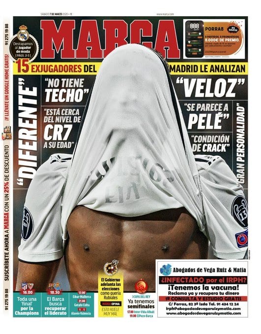Por lo demás, no nos gusta la portada de Marca aunque esta sea un claro elogio a Vinicius. Es una portada que se presta a convertirse en carne de meme. Con ella se atacará al chaval en cuanto haga un mal partido. Por eso no nos gusta. Y porque Vinicius es Vinicius, no una imitación de nadie. Tiempo habrá para comprobarlo. El futuro es suyo.