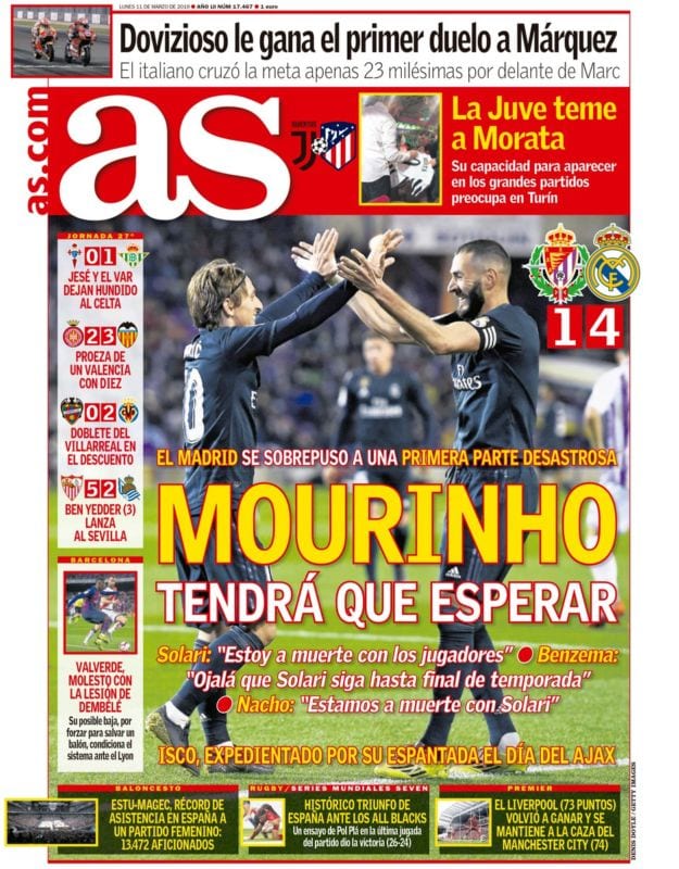 Pero volvamos a la segunda portada, esa en la que vemos a Hazard y Pogba con sus respectivas selecciones. En ella, Relaño habla del nuevo proyecto de Zidane. Hasta ahí bien, ¿no? El problema viene cuando retrocedes al 11 de marzo y te encuentras en 'La Ouija Today' con la figura de Mouriho, que parecía el elegido para sustituir a Solari.