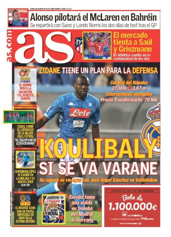 En ese futuro también podría estar Koulibaly, co-protagonista de uno de esos combos perfectos que tanto utilizan los medios deportivos españoles para salir airosos. El central del Nápoles estaría en la agenda si Varane se va. Si el francés abandona el Real Madrid, Koulibaly podría ser una opción. Eso no quiere decir que venga, o quizá sí, aunque más bien no, pero a la vez sí.