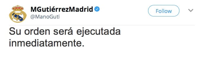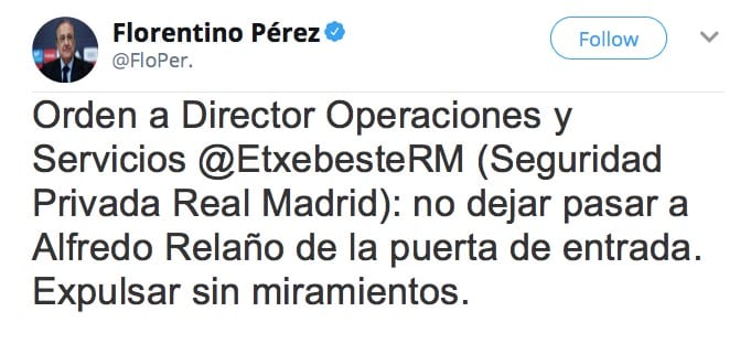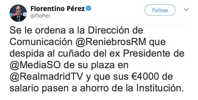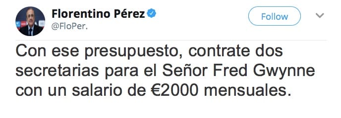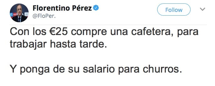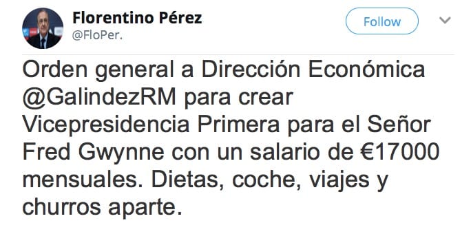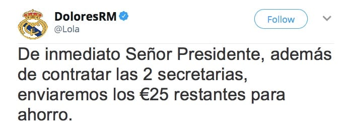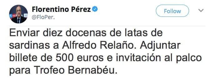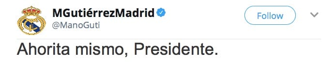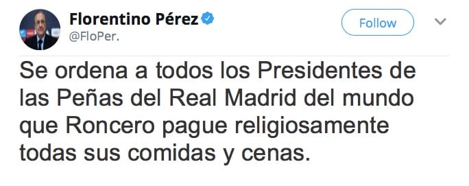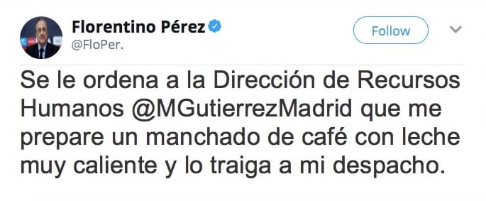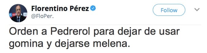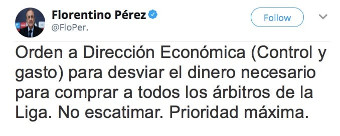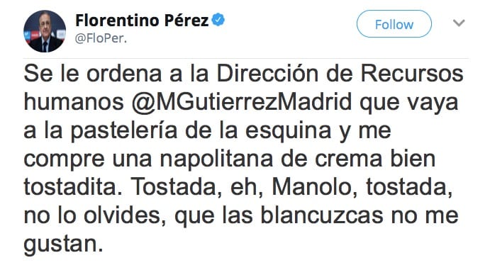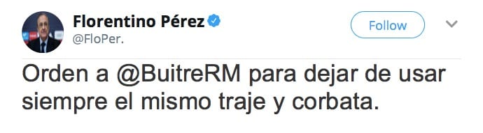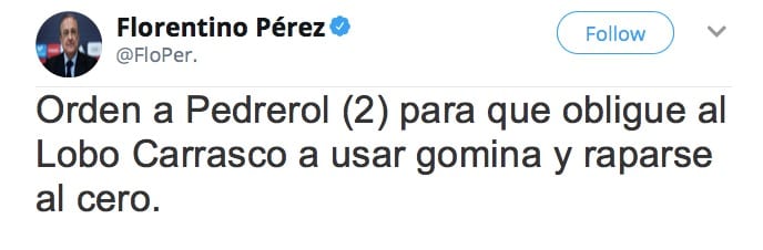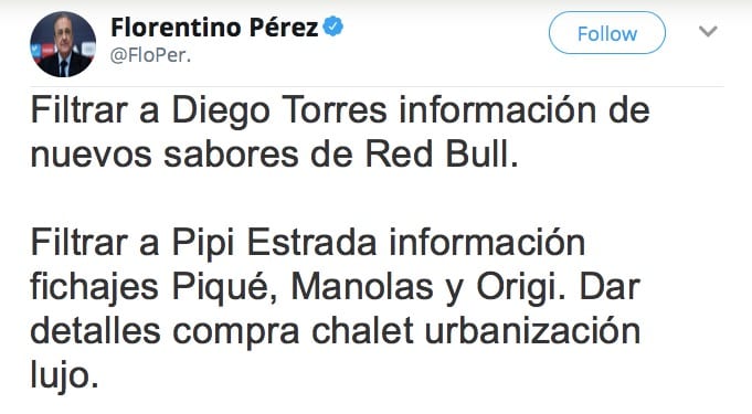 Una semana y veinte tuits más tarde estaba convencido de que dirigir el Real Madrid desde Twitter era la mejor medida que había tomado en toda su carrera de Presidente. Ni le importunaban ni le contradecían ni le hacían perder el tiempo en tediosas reuniones que nunca llevaban a ningún lado.