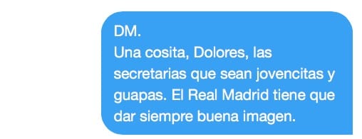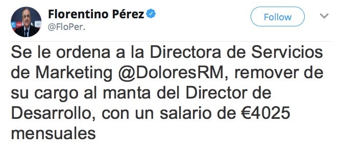 -He reflexionado muy seriamente, he consultado a ciertos asesores de gran prestigio internacional y he decidido dirigir el Real Madrid a través de Twitter. A partir de hoy no nos volveremos a reunir, recibirán mis órdenes a través de esta red social. Tienen cuatro días para que todos los trabajadores, ustedes incluidos, tengan Twitter. No lo volveré a repetir, cuatro días, ni uno más.