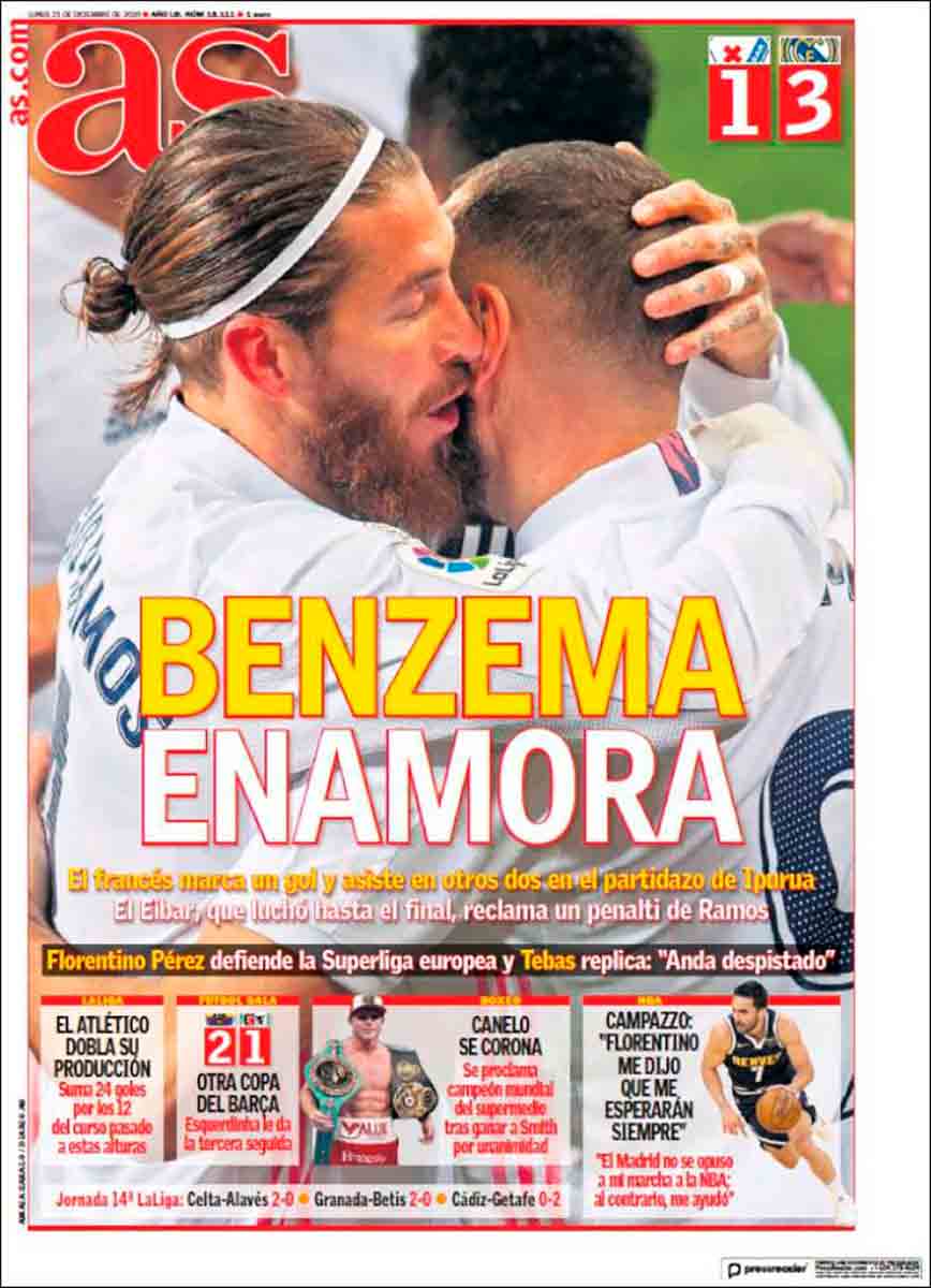 Os dejamos con los diarios deportivos de Madrid, que esta vez no tienen más remedio que rendirse al equipo blanco en general y a Benzema en particular. As llega incluso a titular: “Benzema enamora” sobre una fotografía de Ramos y Karim que nosotros habríamos clasificado con dos rombos.